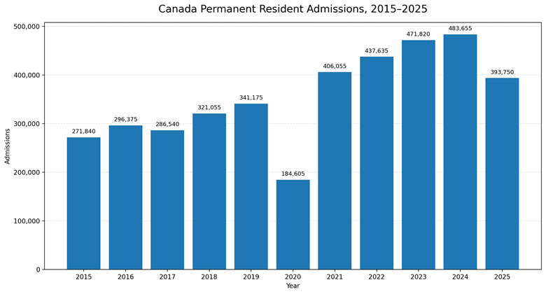 Canada admitted 393,750 permanent residents in 2025. This was slightly below the planned target of 395,000 and marked a decrease from the record levels seen in 2023 and 2024, reflecting a shift toward more controlled immigration growth.