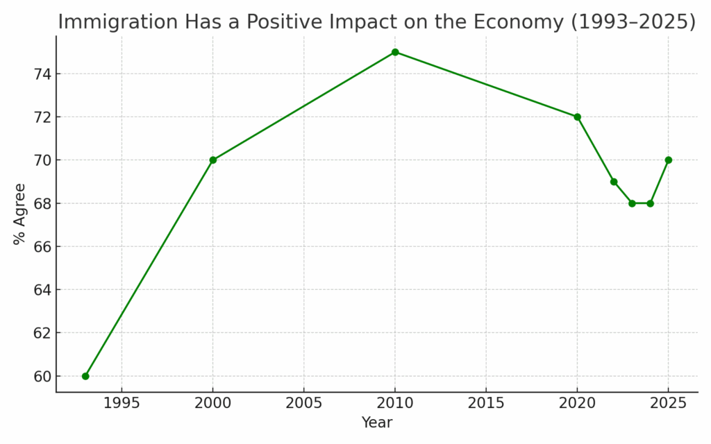 Yes. Seven in ten Canadians believe immigration benefits the economy by filling labour shortages, creating jobs, and supporting growth, though optimism varies by political affiliation.