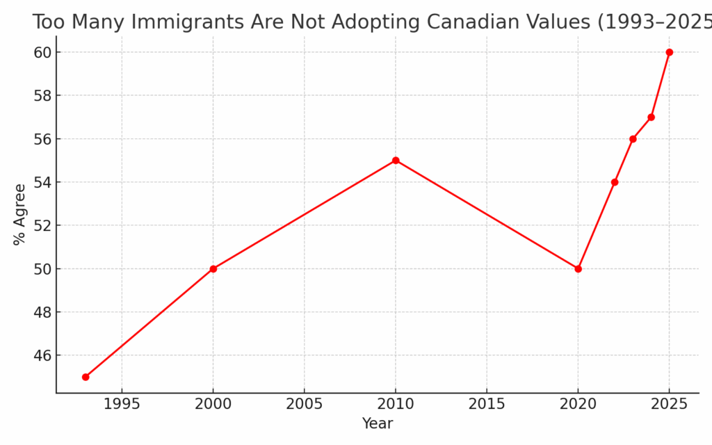 Canadians are becoming more anxious about social cohesion. Sixty per cent now say too many immigrants are not adopting Canadian values, up three points from last year and continuing a three-year upward trend.