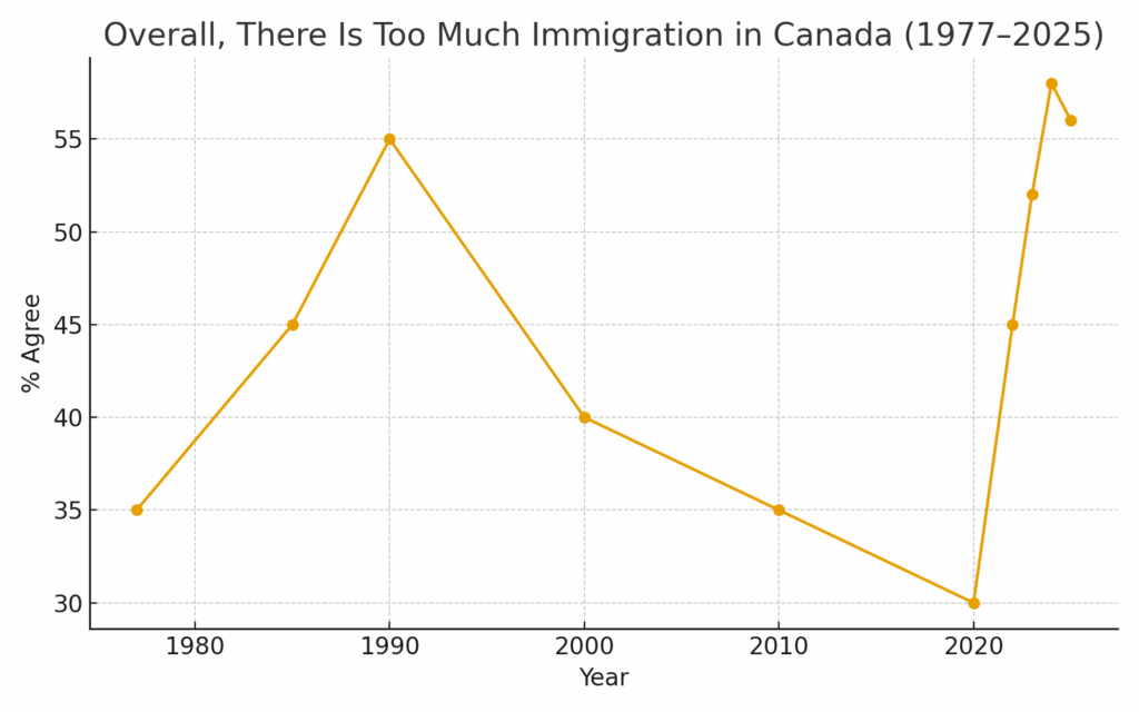 A majority of Canadians – 56 per cent – continue to say there is too much immigration. This figure has stabilised after two years of sharp increases. The concern is now less about newcomers themselves and more about government performance.