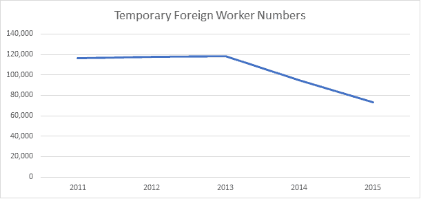 As a result of the Conservative changes, the numbers of temporary workers in Canada were dramatically reduced, from almost 120,000 in 2013 to under 75,000 in 2015.