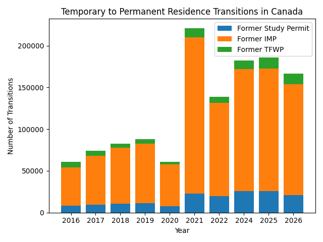 While much attention focuses on high-skilled mobility pathways, the data also shows a gradual increase in transitions from the Temporary Foreign Worker Program.
