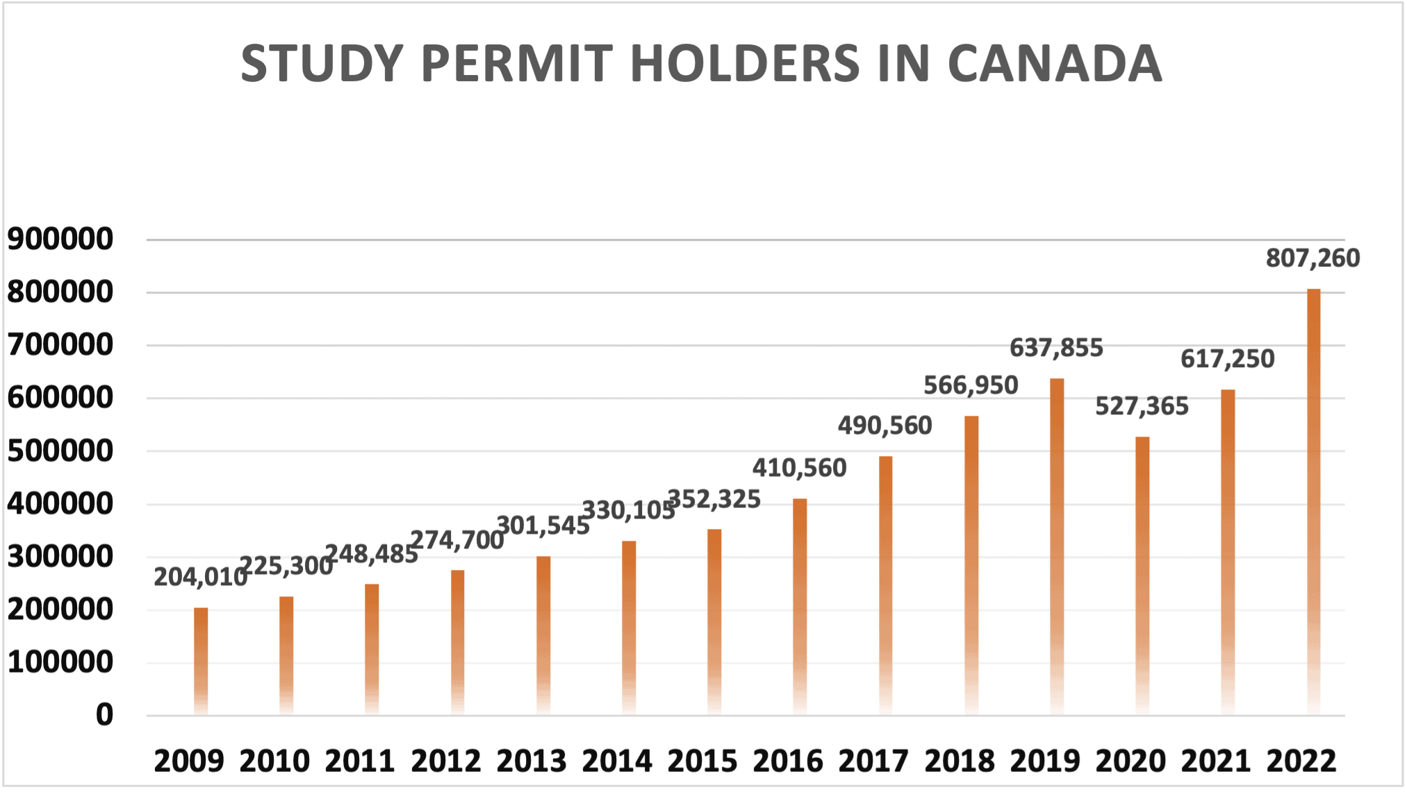 The latest data from Immigration, Refugees and Citizenship Canada (IRCC) reveals there were 807,260 study permit holders in Canada on Dec. 31 last year, up almost 30.8 per cent from the 617,250 study permit holders in 2021.