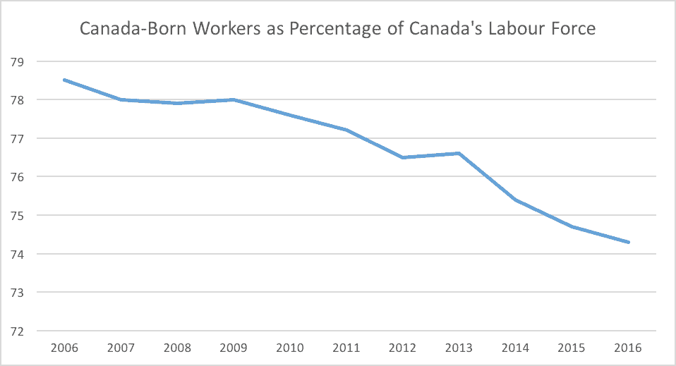 At the same time, further figures show the percentage of immigrants in the working-age population has been steadily increasing for the last decade as the Canada-born proportion drops, illustrating the need to make up for the shortfall by bringing in foreign workers.