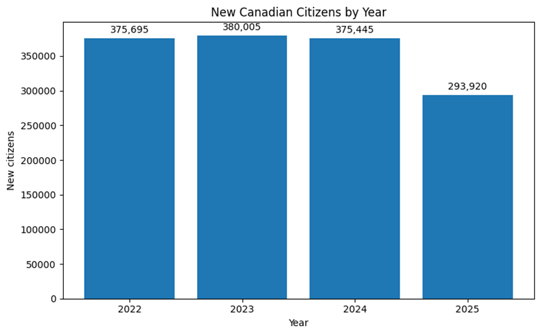 Canada granted citizenship to 375,695 people in 2022, 380,005 in 2023 and 375,445 in 2024. In 2025, that figure fell to 293,920.